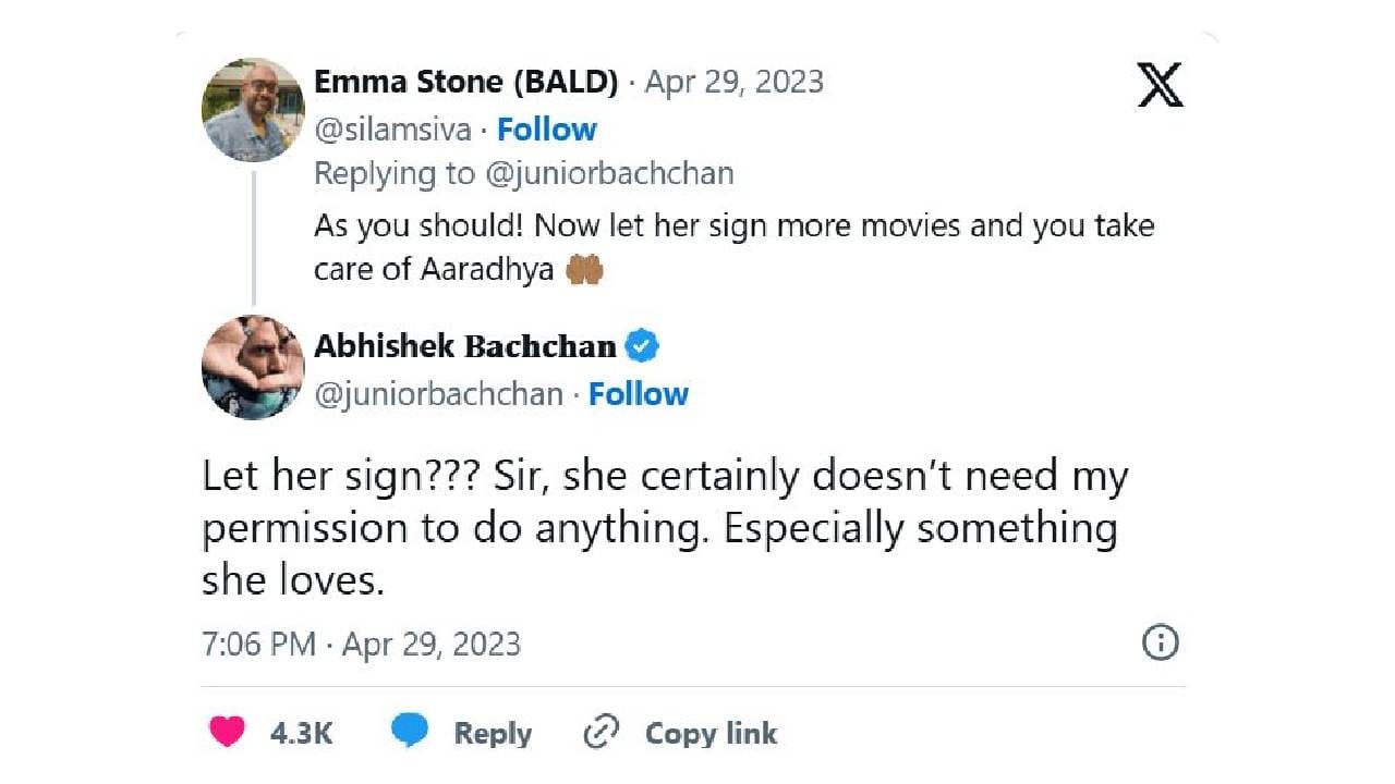 “आता ऐश्वर्याला आणखी चित्रपट साईन करू दे आणि आराध्याची काळजी तू घे”, अशी कमेंट संबंधित युजरने लिहिली होती. त्यावर अभिषेकने त्याला सडेतोड उत्तर दिलं होतं. “तिला साईन करू द्या? सर, तिला कोणत्याच गोष्टीसठी माझ्या परवानगीची गरज नाही, विशेषकरून अशा गोष्टी ज्या तिला आवडतात”, अशी प्रतिक्रिया अभिषेकने दिली होती. त्याचं हे उत्तर सोशल मीडियावर तुफान व्हायरल झालं होतं.