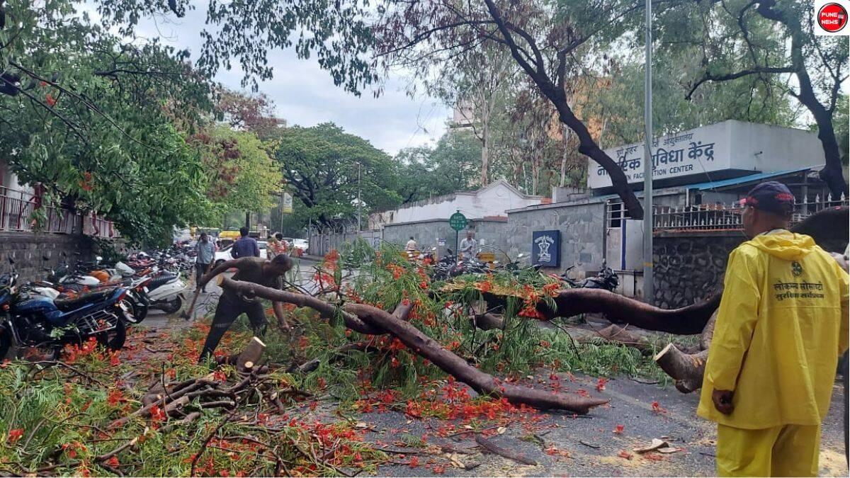 सोसाट्याच्या वाऱ्यामुळे बंडगार्डन भागात पोलीस आयुक्तालयाजवळील झाड उन्मळून पडले. त्या भागात दुतर्फा दुचाकी वाहनांचे पार्किंग आहे. झाड कोसळल्याने त्याखाली पंचवीस दुचाकी सापडल्या. या घटनेची अग्निशामक दलाला माहिती मिळाल्यानंतर पथक तातडीने घटनास्थळी पोचले. त्यांनी कटरच्या साहाय्याने झाड कापून रस्ता रिकामा केला. कर्वे रस्त्यावर सह्याद्री रुग्णालयाच्या मागच्या बाजूची सीमाभिंत कोसळून दुचाकी आणि चारचाकी वाहनांचे नुकसान झाले.