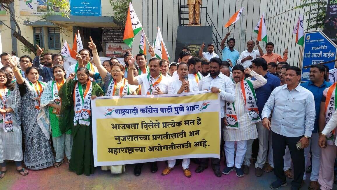 पुणे : मागील तीन महिन्यामध्ये वेदांता फॉक्सकॉन, बल्क ड्रग पार्क, मेडिकल इक्विपमेंट पार्क, टाटा एअरबससह तब्बल २२ प्रकल्प हे महाराष्ट्रामधून गुजरातसह इतर राज्यात गेल्याच्या निषेधार्थ आज पुण्यात राष्ट्रवादी काँग्रेस पक्षाच्या वतीने मामलेदार कचेरीसमोर आंदोलन करण्यात आले. हे आंदोलन राष्ट्रवादी काँग्रेस पक्षाचे शहराध्यक्ष प्रशांत जगताप यांच्या नेतृत्वाखाली करण्यात आले. यावेळी केंद्र आणि राज्य सरकार विरोधात जोरदार घोषणा बाजी देखील यावेळी करण्यात आली.