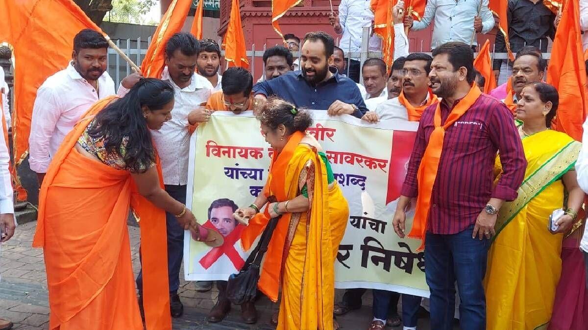 पुणे : भारत जोडो यात्रे दरम्यान काँग्रेस पक्षाचे नेते खासदार राहुल गांधी यांनी स्वा.सावरकरांविषयी वादग्रस्त विधान केल्याने भाजप आणि बाळासाहेबांची शिवसेना राज्यभरात आक्रमक झाली आहे. त्या पार्श्वभूमीवर आज पुण्यातील सारसबागेसमोरील स्वा. सावरकर यांच्या पुतळ्यास पुष्पहार अर्पण करून राहुल गांधी यांच्या फोटोला जोडे मारो आंदोलन करण्यात आले. हे आंदोलन पुणे संपर्क प्रमुख अजय भोसले आणि शहरप्रमुख नाना भानगिरे यांच्या नेतृत्वाखाली करण्यात आले.