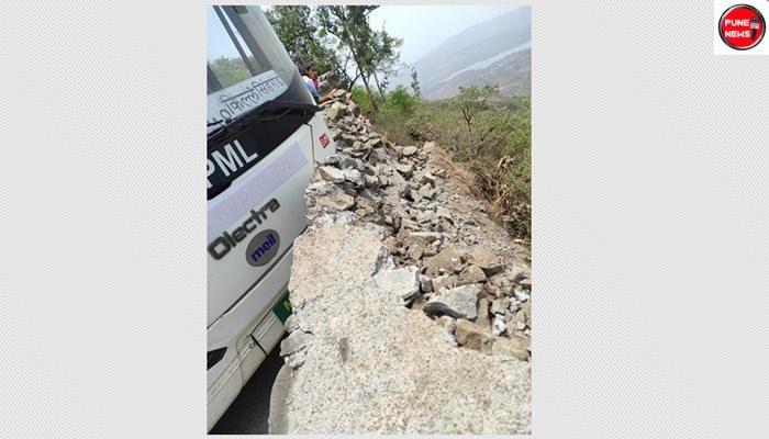 सिंहगड किल्ल्यावरून पायथ्याला जाणाऱ्या ई-बस चालकाला उतारावर वळणाचा अंदाज आला नाही. त्यामुळे गाडी कठड्याच्या संरक्षक भिंतीला धडकली. या संरक्षक भिंतीच्या खाली मोठी दरी होती. मात्र चालकाने गाडीवर नियंत्रण मिळविल्याने दुर्घटना टळली. या गाडीत २८ प्रवासी होते. मात्र कोणालाही दुखापत झाली नाही, अशी माहिती पीएमपी प्रशासनाकडून देण्यात आली. पीएमपी आणि वन विभागाच्या वतीने महाराष्ट्र दिनापासून सिंहगडावर वातानुकूलित बससेवा सुरू करण्यात आली आहे. त्यासाठी वीजेवर धावणाऱ्या गाड्या (इलेक्ट्रीकल बस- ई-बस) उपलब्ध करून देण्यात आल्या आहेत. सिंहगड किल्ल्यावर खासगी वाहने घेऊन जाण्यास मनाई करण्यात आली आहे. त्यामुळे किल्ल्यावर जाण्यासाठी ई-बसचा वापर करावा लागत आहे. सिंहगडावर ई-बसची सुविधा सुरु झाल्यानंतर पर्यटकांनी अनेक तक्रारी केल्या होत्या. शनिवार-रविवार सुट्टीच्या दिवशी अपुऱ्या गाड्या असल्याने गाड्यांसाठी प्रतिक्षा करावी लागत होती. त्यातच चार्जिंग संपल्याने पर्यटकांना तीन ते चार तास ताटकळत थांबावे लागण्याच्या तसेच वळणावरील चढामुळे प्रवाशांनाही ई-बसला धक्का द्यावा लागत असल्याच्या घटना पुढे आल्या होत्या. त्यातच गाडीचा किरकोळ अपघात झाल्याने या सेवेवर प्रश्नचिन्ह निर्माण झाले आहे. दरम्यान, पीएमपीच्या ताफ्यात नऊ मीटर लांबीच्या ई-बस असताना बारा मीटर लांबीच्या मोठ्या गाड्यांचा वापर का केला जात आहे, असा प्रश्नही पर्यटकांकडून आणि प्रवासी संघटनांकडून उपस्थित करण्यात आला आहे.