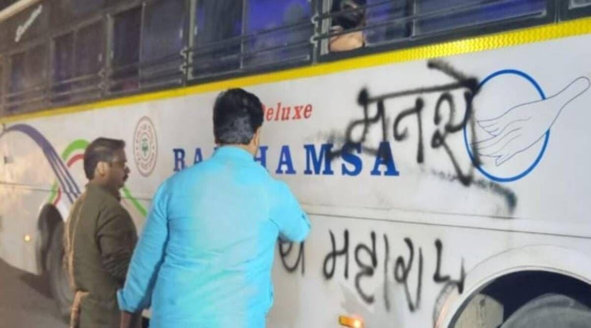 महाराष्ट्र आणि कर्नाटक राज्यांत सीमावाद पेटला असून बेळगाव येथील हिरेबागवाडी टोल नाक्यावर महाराष्ट्राच्या वाहनांवर दगडफेक करण्यात आल्याची घटना घडली आहे. या घटनेचे पडसाद राज्यभरात उमटत असून राज्यातील अनेक संघटना कर्नाटक सरकार विरोधात आक्रमक झाल्याचे पाहण्यास मिळत आहे.त्याच दरम्यान आज दुपारच्या सुमारास पुण्यातील स्वारगेट एस.टी स्थानकापासून काही अंतरावर असलेल्या लक्ष्मी नारायण टॉकीज जवळील सना पार्क येथे उभ्या असलेल्या कर्नाटकच्या बसलेला ठाकरे गटाच्या युवा सेनेच्या कार्यकर्त्यांनी काळे फासले.तर भगव्या अक्षरात जय महाराष्ट्र लिहून निषेध नोंदविण्यात आला.या आंदोलन प्रकरणी स्वारगेट पोलिसांनी सात जणांना अटक करण्यात आली होती.ती घटना थांबत नाही. तोवर मनसेचे पुणे शहर अध्यक्ष साईनाथ बाबर यांच्या नेतृत्वाखाली पुणे सातारा महामार्गवरील स्वामी नारायण मंदिराजवळ कर्नाटकच्या बस अडवून, त्यावर काळे फासण्यात आले असून जय महाराष्ट्र, जय मनसे असे लिहून निषेध नोंदविण्यात आला.या आंदोलन प्रकरणी मनसे शहर अध्यक्ष साईनाथ बाबर, विक्रांत अमराळे,युवराज लांडगे, सचिन काटकर यांच्यासह कार्यकर्त्यांना पोलिसांनी ताब्यात घेतले.