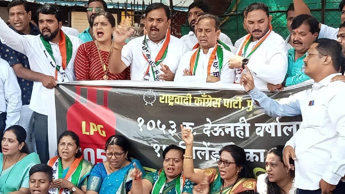 राष्ट्रवादी काँग्रेसचे शहराध्यक्ष प्रशांत जगताप यांच्या नेतृत्वाखाली आंदोलन करण्यात आले. प्रवक्ता प्रदीप देशमुख, महिला शहराध्यक्षा मृणालिनी वाणी, मनीषा होले, किशोर कांबळे, मनोज पाचपुते, अजिंक्य पालकर, उदय महाले, रोहन पायगुडे, संतोष हत्ते, गोरक्षनाथ भिकुले यांच्यासह अन्य कार्यकर्ते, पदाधिकारी या वेळी उपस्थित होते.सर्वसामान्य नागरिकांच्या दररोजच्या स्वयंपाक घरातील अत्यावश्यक वस्तूंवरही वस्तू आणि सेवा कर केंद्र सरकराने लावला. सिलिंडरच्या किमतही केंद्र सरकारकडून वाढविण्यात आल्या. गॅस सबसिडी बंद करण्यात आली. आता एका कुटुंबाला वर्षात केवळ पंधरा सिलिंडर देण्याचा निर्णय घेण्यात आला आहे. त्यामुळे काळाबाजार होण्याची शक्यता वाढली आहे.