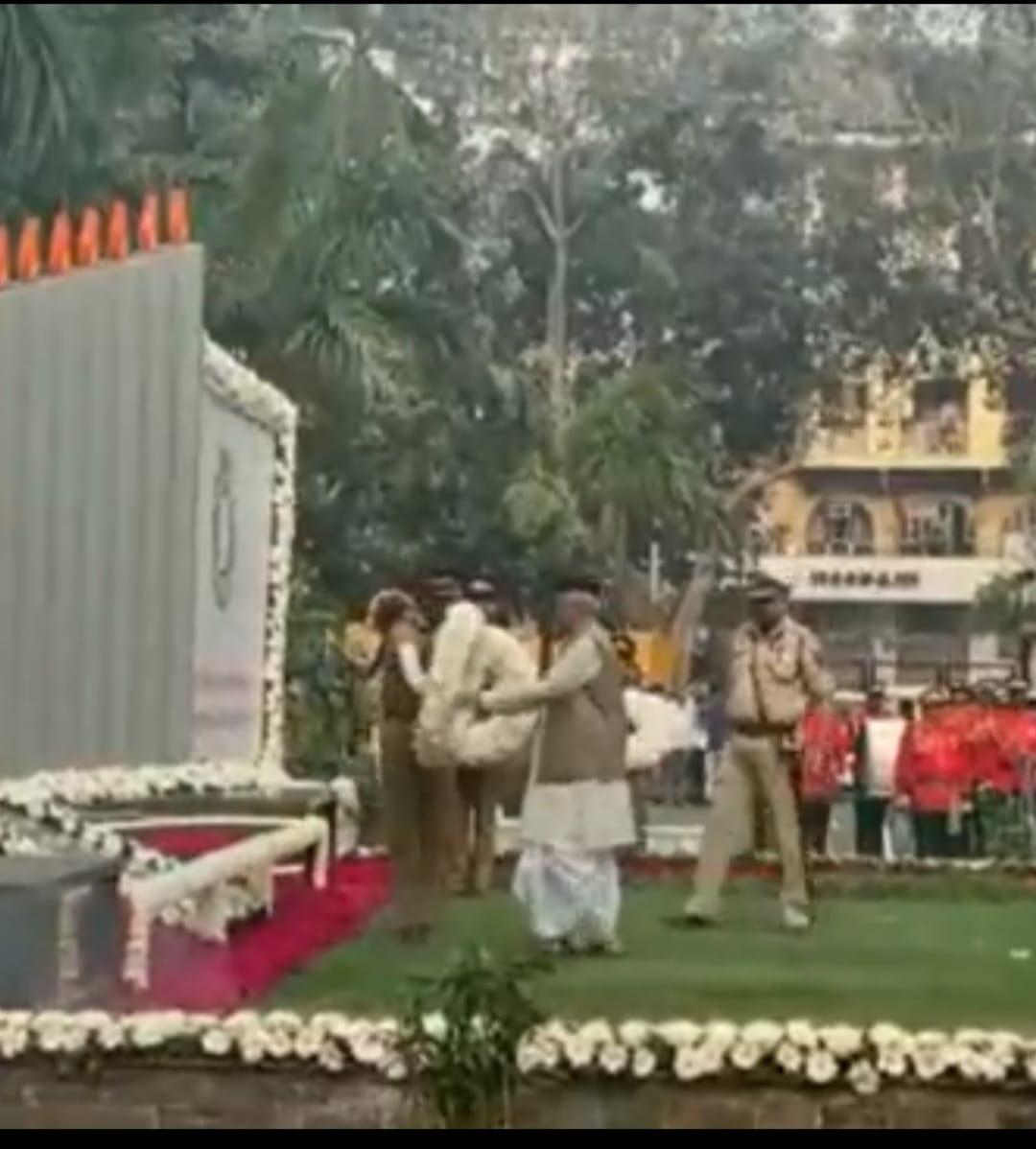 तर दुसरीकडे राज्यपालांनी थेट चप्पल घालून शहिदांना अभिवादन केल्यानं नाराजी व्यक्त केली जात आहे. दरम्यान, राज्यपालांच्या या कृतीची भाजप नेते मंगलप्रभात लोढा यांनी सारवासारव केली. 'आम्ही शहिदांना अभिवादन करत असताना पोलिसांनी आम्हाला सांगितलं होतं, चप्पल घालून किंवा काढून अभिवादन करू शकता, त्यामुळेच राज्यपालांची चप्पल काढली नाही, असं लोढा यांनी म्हटलं आहे.