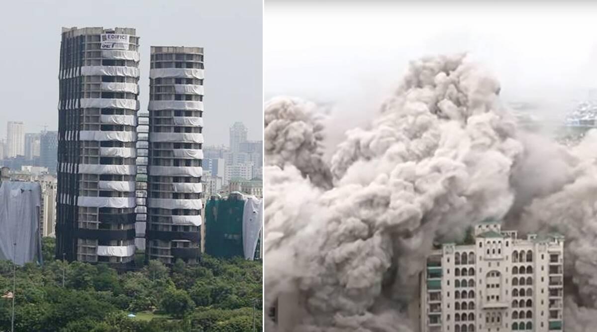 नोएडातील अनधिकृतपणे बांधण्यात आलेले महाकाय ट्विन टॉवर्स अवघ्या १० सेकंदांमध्ये जमीनदोस्त करण्यात आले आहेत. ९ वर्षांच्या प्रदीर्घ न्यायालयीन लढाईनंतर ‘एपेक्स’ आणि ‘सेयान’ हे ‘सुपरटेक’ कंपनीच्या मालकीचे महाकाय टॉवर्स पाडण्यात आले आहेत. ‘एपेक्स’ ही इमारत ३२ मजली तर ‘सेयान’ २९ मजल्यांची इमारत होती. या इमारती जमीनदोस्त करण्यात आल्यानंतर लगतच्या परिसरामध्ये धुळीचं साम्राज्य निर्माण झालं आहे.
