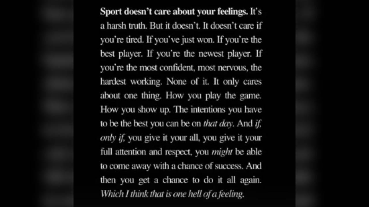 तिने पुढे म्हटले, “खेळाला फक्त एकाच गोष्टीशी देणंघेणं असतं – ती म्हणजे तुम्ही मैदानावर तो सामना कसा खेळता. त्या दिवशी सर्वोत्तम कामगिरी करण्यासाठी तुम्ही कोणत्या जिद्दीने उतरता, हेच सर्वांत महत्त्वाचे ठरते. जर तुम्ही खेळाला पूर्ण आदर देऊन तुमचे सर्वस्व अर्पण केले, तरच यशाची संधी मिळू शकते. ही प्रक्रिया पुन्हा पुन्हा अनुभवण्याची मिळणारी संधी ही खरोखरच अप्रतिम आहे. मला वाटतं ही एक भयानक (अद्भुत) भावना आहे.”