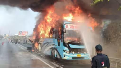 Bus Fire : मुंबई-पुणे द्रुतगती मार्गावर आज मोठी दुर्घटना टळली आहे. खाजगी बसने अचानक पेट घेतला होता. टायर फुटल्याने बसने पेट घेतल्याची माहिती आहे. या बसमध्ये अनेक प्रवासी प्रवास करत होते. मुंबईहूनपुण्याच्या दिशेने ही बस निघाली होती. आढे गावच्या हद्दीत सकाळच्या सुमारास ही घटना घडली. बसने अचानक पेट घेतल्याने अनेक प्रवाशांचा जीव धोक्यात आला होता. चालकाने प्रसंगावधान दाखवत सर्व प्रवाश्यांना सुखरूप खाली उतरवलं त्यामुळे कोणत्याही प्रवाशाला दुखापत झाली नाही आहे, सगळे प्रवासी सुखरुप आहे. आगीवर अग्निशमन दल आणि यंत्रणेने नियंत्रण मिळवले आहे.