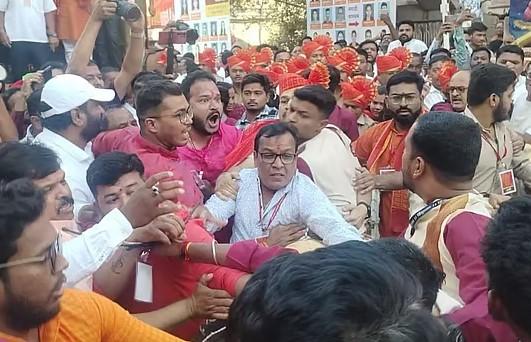 Clash During Hanuman Jayanti Procession in Sangamner : श्री हनुमान जयंती निमित्त महाराष्ट्रातील विविध ठिकाणी व मंदिरांमध्ये हनुमान जन्मोत्सव साजरा करण्यात येणार आहे. हनुमान जयंतीनिमित्त राज्यात उत्साह पाहायला मिळत आहे. अनेक ठिकाणी मिरवणुका काढल्या जात आहे. याच उत्साहाच्या वातावरणाला गालबोट (Hanuman Jayanti celebration disrupted) लागलेत. अहिल्यानंतरमध्ये हनुमान जयंतीच्या मिरवणुकीत जोरदार राडा झाला आहे. आमदार आणि पोलिसांसमोरच राडा (Clash during Hanuman Jayanti rally) झाल्यामुळे याची नगरमध्ये जोरदार चर्चा होत आहे.