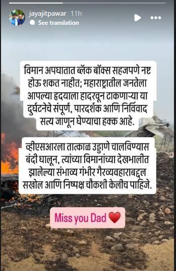 याच प्रकरणात आता एक मोठी अपडेट समोर आली आहे. अजित पवार यांचा मुलगा, जय पवार यांनीही या विषयावर पहिल्यांदाच आपलं मौन सोडलं आहे. जय पवार यांनी काही तासांपूर्वी त्यांच्या इन्स्टाग्राम अकाऊंटवर एक स्टोरी शेअर केली असून ती खूप चर्चेत आली आहे. यामध्ये त्यांनी अजित पवार यांच्या विमान अपघाताचा एक फोटो टाकला असून त्यासह काही जकूरही पोस्ट केला आहे. त्यामध्ये त्यांनी ब्लॅक बॉक्सबद्दलही लिहील आहे. तसेच VSR कंपनीला उड्डाण चालवण्यास बंदी घालण्याची मोठी मागणीही त्यांनी केली आहे. या पोस्टसह अजित पवारांच्या कुटुंबातील व्यक्तीकडून पहिल्यांदाच अजित दादांच्या अपघातावर जाहीरपणे प्रतिक्रिया देण्यात आली आहे.