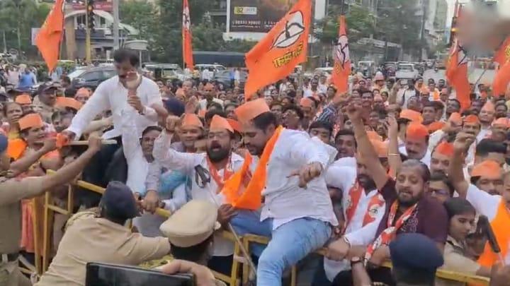 या बंदीविरोधात आज शिवसेना शिंदे गट तसेच शिवसेना ठाकरे गटाच्या कार्यकर्त्यांनी घंटानाद आंदोलन केले. टिळक चौकातून या आंदोलनाला सुरूवात झाली. आंदोलनावेळी शिवसेना ठाकरे गट तसेच शिंदे गटाचे कार्यकर्ते आमने- सामने आल्याचे पाहायला मिळाले. दोन्ही गटाच्या कार्यकर्त्यांनी यावेळी जोरदार घोषणाबाजी केली तसेच कार्यकर्त्यांमध्ये बाचाबाची झाल्याचेही पाहायला मिळाले. या आंदोलनाच्या पार्श्वभूमीवर परिसरात मोठा पोलीस बंदोबस्त ठेवण्यात आला आहे.