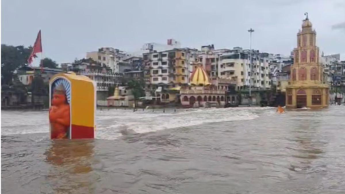 नाशिक जिल्ह्यातील दमदार पाऊस झाला. धरण उगम क्षेत्रात पाऊस झाल्याने गोदावरी नदीला पूर आलाय. त्र्यंबकेश्वर भागात दिवसभर अतिजोरदार पाऊस झाला. सायंकाळी साडेपाच वाजेपर्यंत 106 मिमी इतका पाऊस झाल्याची नोंद करण्यात आलीय. यामुळे अंजनेरी गडावरून असे पाण्याचे लोंढे वाहू लागलेत. तर गंगापूर धरणातून 7000 क्युसेस पाण्याचा विसर्ग केल्याने गोदावरी नदीला पूर आलाय. पुराचे इंडिकेटर म्हणून ओळखल्या जाणाऱ्या दुतोंड्या मारुतीच्या छाती एवढं पाणी आलाय. पुरामुळे गोदा घाटावरचे छोटे-मोठे मंदिर गेले पाण्याखाली गेलेत. पावसाचा जोर कायम राहिलास गंगापूर धरणातून टप्प्याटप्प्याने गोदावरी नदीत वाढवणार पाण्याचा विसर्ग करण्यात येणार आहे.