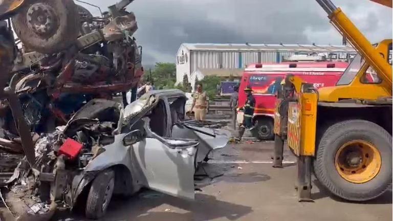 या भयानक अपघातात कारचालकासह एका महिलेचा जागीच मृत्यू झाला. तर कारमधील ४ महिला गंभीर जखमी झाल्या. अपघातानंतर महामार्गावर वाहनांच्या लांबच लांब रांगा लागल्या होत्या. पोलिसांनी तातडीने घटनास्थळी धाव घेत बचावकार्य सुरू केले. सध्या वाहतूक सुरळीत करण्याचे काम सुरू आहे.