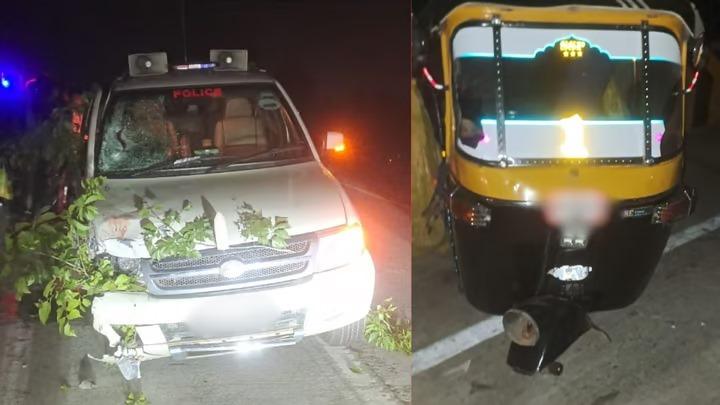 पोलीसाच्या वाहनाचा दुचाकी आणि रिक्षाची धडक झाली. या अपघात रिक्षातील ७ जण तर दुचाकीवरील २ जण जखमी झाले आहेत. वाहनाचा टायर फुटल्याने अपघात झाल्याची माहिती मिळत आहे. ताफ्यातील अपघातात आमदार भोंडेकर सुखरुप आहेत.