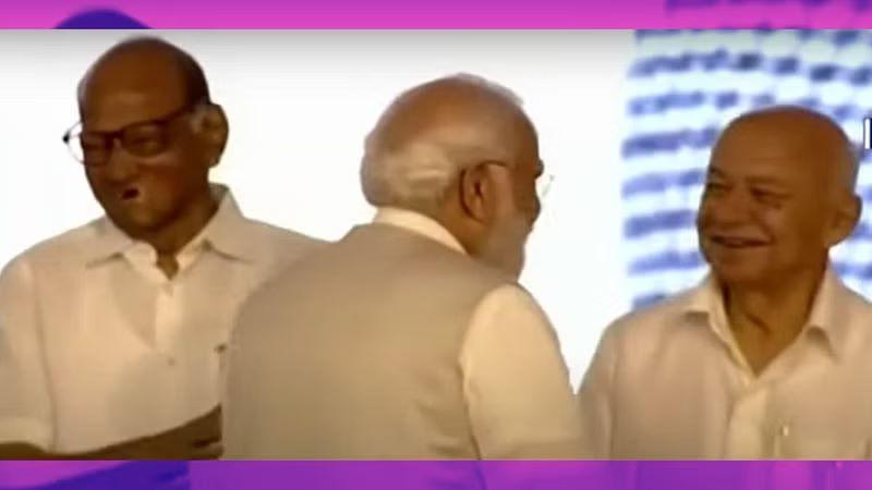 व्यासपीठावर पोचताच पंतप्रधान नरेंद्र मोदी यांनी सर्वांसोबत हस्तांदोलन केलं. यावेळी शरद पवार आणि मोदींमध्ये काहीतरी गोष्टीवरून हास्यविनोद रंगला. यावेळी शरद पवार यांनी हसून पंतप्रधान नरेंद्र मोदी यांच्या पाठीवर कौतुकाची थाप मारली. दोन बड्या नेत्यांमध्ये रंगलेला हा हास्यविनोद कॅमेऱ्याने अचूक टिपला.