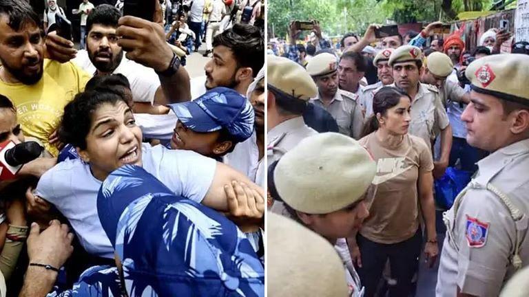 हातात तिरंगा घेऊन नवीन संसद भवनापर्यंत पोहोचण्यासाठी कुस्तीपटूंनी पोलिसांनी लावलेले बॅरिकेडिंग ओलांडून पुढे जाण्याचा प्रयत्न केला. त्यानंतर पोलिसांशी झालेल्या चकमकीत फोगट बहिणी जमिनीवर पडल्या. एवढेच नाही तर पोलिसांनी साक्षी मलिकसह बजरंग पुनिया, विनेश फोगट यांना ताब्यात घेतले. यामुळे सध्या जंतर-मंतर परिसरामध्ये गोंधळाचे वातावरण आहे. कुस्तीपटूंना ताब्यात घेतल्यानंतर त्यांच्या खुर्च्या, तंबू आणि इतर सामान जंतरमंतरवरून हटवण्यात येत आहे. पोलिसांनी रोखल्यानंतर कुस्तीपटू केरळ हाऊसजवळ ठिय्या मांडून बसले आहेत. येथून संसद भवन हाकेच्या अंतरावर आहे.