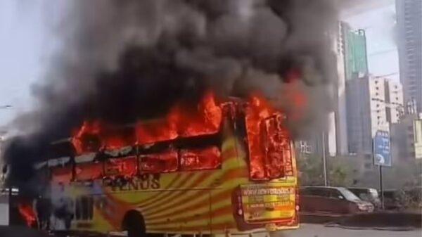 मालाड पूर्वेकडील वेस्टर्न एक्सप्रेस हायवेवरून ही खासगी स्लीपर बस प्रवास करत होती. सदर बस मुंबईहून उज्जैनकडे जात असल्याची माहिती समोर आली आहे. प्रवाशांनी भरलेल्या या बसने अचानक पेट घेतल्यानं परिसरात एकच खळबळ उडाली. या आगीमुळे वेस्टर्न एक्सप्रेस हायवेवरील दोन्ही बाजूंची वाहतूक काही काळासाठी पूर्णपणे विस्कळीत झाली होती. व्हायरल झालेल्या व्हिडिओमध्ये पिवळ्या रंगाची ही खासगी बस मेट्रो ब्रिजखाली आगीच्या भयानक थारोळ्यात दिसून येत असून, बसच्या आजूबाजूला दाट काळा धूर पसरलेला स्पष्टपणे दिसत आहे.