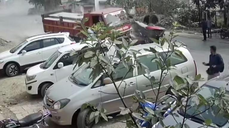 अपघाताच्या सीसीटीव्ही फुटेजमध्ये दिसत आहे की, एक व्यक्ती आपली स्कूटर काढत असताना अचानक भरधाव टेम्पो येतो आणि त्यासह सहा वाहनांना धडक देतो. टेम्पो त्याकडे येत असल्याचे पाहून तो थोडा सावध होतो आणि वेळीच स्कूटर सोडून जवळच उभ्या असलेल्या दोन कारच्या मधल्या जागी उडी घेतो.