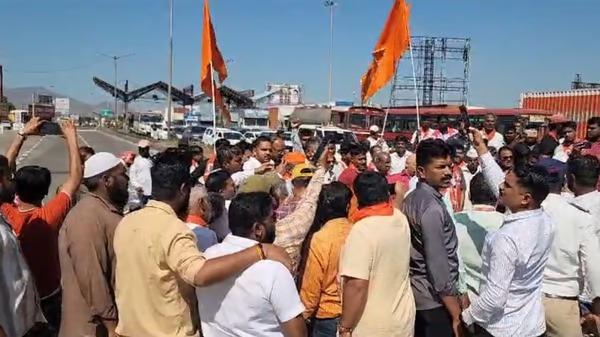 Pune Bangalore National Highway : पुणे बंगळुरू राष्ट्रीय महामार्गावरील साताऱ्यातील आनेवाडी टोलनाक्यावर उध्दव बाळासाहेब ठाकरे शिवसेना यांच्यावतीने टाेल माफीसाठी आज (साेमवार) रास्ता राेकाे आंदाेलन करण्यात आले आहे. यामुळे टाेल नाका परिसरात वाहनांच्या रांगा लागल्या आहेत.