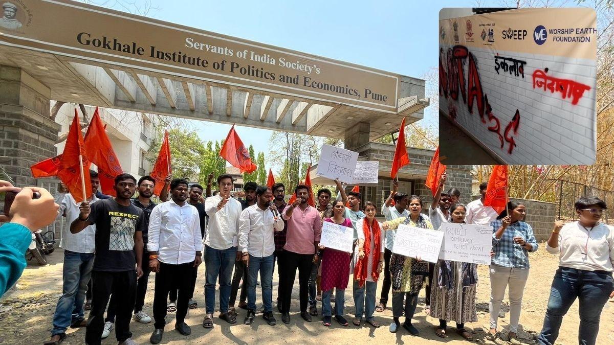 Pune Gokhale Institute : पुण्याच्या गोखले इन्स्टिट्यूटमध्ये धक्कादायक घटना घडली आहे. गोखले इन्स्टिट्यूट ऑफ पुणे येथील अकॅडमी बिल्डिंगमध्ये गेल्या काही दिवसांपासून लावलेल्या इलेक्शन कमिशनच्या पोस्टरवर लोकशाहीविरुद्ध आणि देशविरोधी वाक्य लिहिण्यात आली आहेत. त्याचसोबत या इन्स्टिट्यूटमध्ये लावण्यात आलेले पोस्टरची छेडछाड करण्यात आली आहे. इन्स्टिट्यूटच्या भिंतींवर इन्कलाब झिंदाबाद असे लिहिण्यात आले आहे. त्यामुळे एकच खळबळ उडाली. अशात संस्थेने या घटनेची गंभीर दखल घेत दोषी विद्यार्थ्यांविरोधात कारवाई केली आहे.