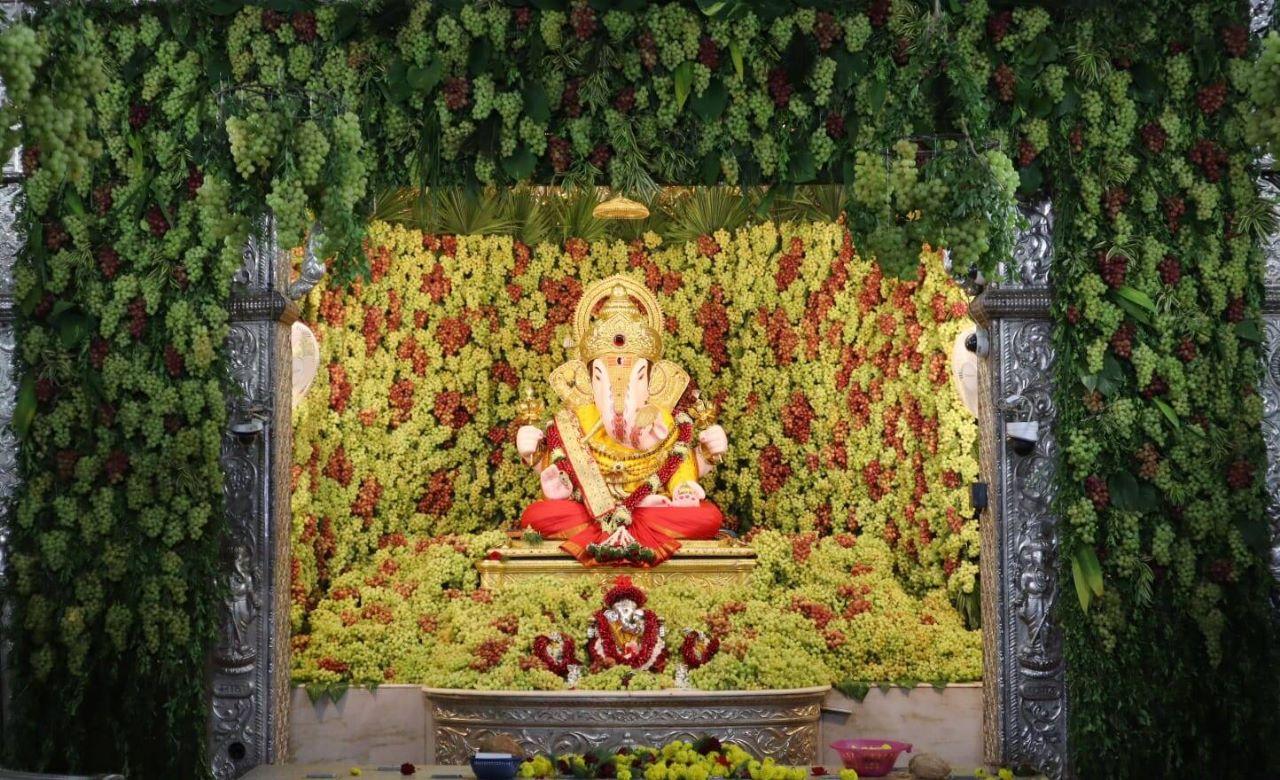 पुणे : श्रीमंत दगडूशेठ हलवाई सार्वजनिक गणपती ट्रस्टतर्फे संकष्टी चतुर्थीनिमित्त मंदिरात द्राक्ष महोत्सव साजरा करण्यात आला. काळ्या आणि हिरव्या द्राक्षांनी मंदिरातील गाभारा व सभामंडप सजला होता. नाशिक येथील सह्याद्री फार्मर्स प्रोड्युसर कंपनीच्या शेतकऱ्यांनी पिकवलेल्या निर्यातक्षम व रसायनविरहित दोन हजार किलो द्राक्षांची आरास करण्यात आली.
