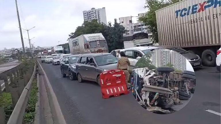 अपघातात कंटेनरचालक किरकोळ जखमी झाला असून त्याला तातडीने उपचारासाठी रुग्णालयात दाखल करण्यात आलं आहे. रस्त्याच्या मध्यभागी कंटेनर उलटल्याने मोठी वाहतूक कोंडी झाली असून वाहनांच्या जवळपास ४ किलोमीटपर्यंतच्या रांगा लागल्या होत्या.
