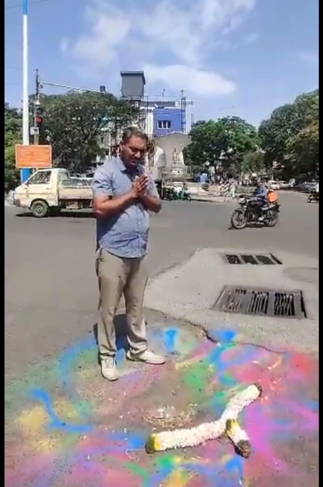 पुणे : कोथरुड भागात रस्त्यावर पडलेले खड्डे पुणे महापालिकेकडून वेळीच दुरूस्त केले जात नाहीत.यामुळे प्रवाशांना त्रासाला सामोरे जावे लागत आहे. पालकमंत्री चंद्रकांत पाटील यांच्या कार्यालयासमोर, महर्षी कर्वे पुतळा चौकात बुधवारी एका व्यक्तीने खड्याला हार घालून व रांगोळी काढून तसेच हात जोडून भर उन्हात आंदोलन केले.