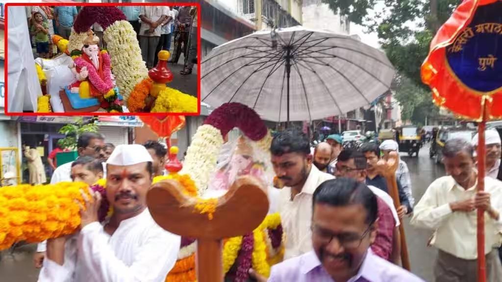 पुणे : आपल्या लाडक्या गणरायाचे आगमन १९ सप्टेंबर रोजी होणार असून जवळपास महिनाभराचा कालावधी राहिला आहे. त्या पार्श्वभूमीवर गणेश मंडळ आणि प्रत्येकाच्या घरात गणरायाच्या आगमनानिमित्त यंदाच्या वर्षी कोणता देखावा करायचा, कशा प्रकारे गणरायाचे स्वागत करायचे याची चर्चा सुरू आहे. त्याच दरम्यान आज पुणे शहरातील मानाचा पाचवा केसरी वाडा गणपतीचे जोरदार पावसात आणि ढोल ताशांच्या गजरात आगमन झाले.