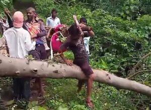 पायवाटेच्या रस्त्यावर पडले मोठे झाड. दरम्यान चिमा पारधी या रुग्ण वृद्धाला दहा किलोमीटर डोलीत पायी घेऊन रुग्णालयात निघालेल्या ग्रामस्थांनी दापूर पासून 5 किमी अंतर कापल्यावर अचानक रस्त्यावर मोठे झाड आडवी पडले व पाय वाट देखील बंद झाली अशा वेळी डोली घेऊन निघालेल्या लोकांनी वृद्ध चिमा पारधी यांना डोली सह उचलून घेत पडलेल्या झाडावर वर चडून खाली उतरून पुढील प्रवास सुरु केला. व वृद्ध रुग्णालय इच्छित रुग्णालयात दखल केले.