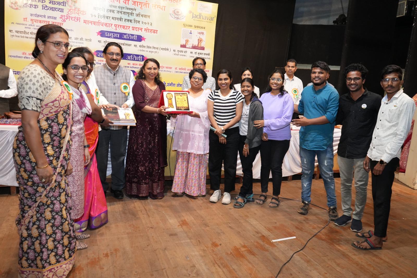 World Human Rights Day : रविवार दिनांक १० डिसेंबर २०२३ रोजी मानवी हक्क संरक्षण व जागृती संस्था, पुणे जिल्हा विधी सेवा प्राधिकरण, जाधवर ग्रुप ऑफ इंन्सिट्यूट यांच्या संयुक्त विद्यामाने जागतिक मानवी हक्क दिनानिमीत्त 'जागर मानवी हक्काचा' या कार्यक्रमाचे आयोजन केले होते. पुण्यातील घोले रोडवरील पंडित जवाहरलाल नेहरू सभागृह व कलादालन येथे सायंकाळी ५ ते ८ या दरम्यान हा कार्यक्रम पार पडला. तसेच या कार्यक्रमात समाजातील विविध क्षेत्रातून मानवतेच्या दृष्टीने सामाजिक कार्य करीत असलेल्या व्यक्ती, संस्था, संघटना व चळवळ यांच्या कार्याला अधिक स्फूर्तीबळ मिळावे या हेतूने त्यांना 'मानवाधिकार पुरस्कारा'ने सन्मानित करण्यात आले.