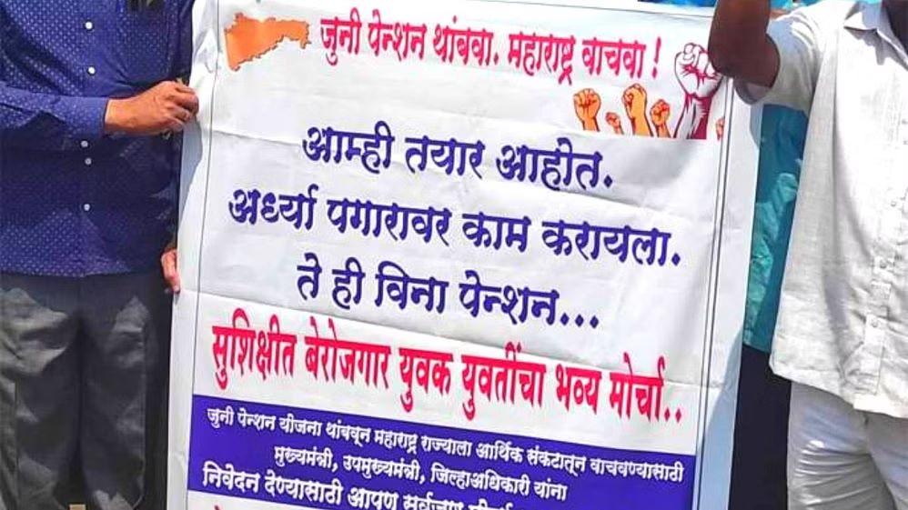 एकीकडे जुन्या पेन्शनसाठी कर्मचाऱ्यांचे आंदोलन तर दुसरीकडे आम्हाला काम द्या. आम्ही अर्ध्या पगारात काम करायला तयार आहे. अशी मागणी करत बेरोजगारांनी काढलेला प्रति मोर्चा हा आज पश्चिम महाराष्ट्रात चर्चेचा विषय झाला आहे.
